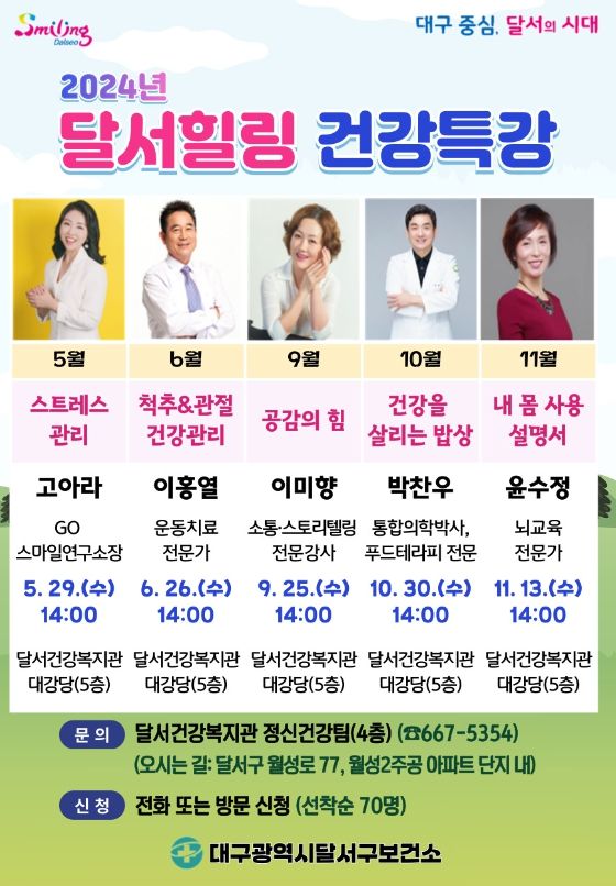 '달서힐링 건강특강'은 지난해 10월 신축 개관한 달서건강복지관에서 추진하는 건강 특화 강연프로그램으로서, 오는 5월 29일 첫 강연을 시작으로 11월까지 총 5회에 걸쳐 진행할 예정이다.