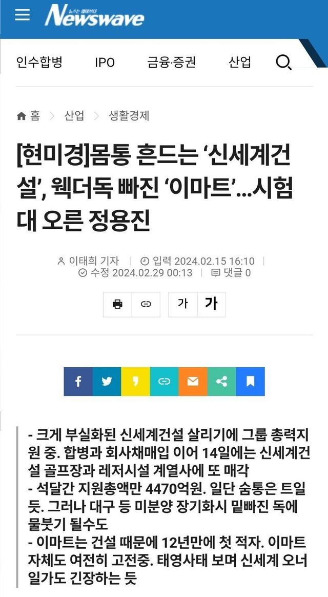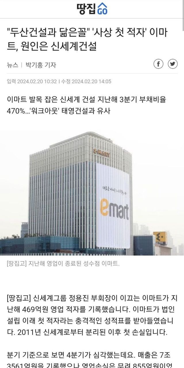 그덕분에 신세계건설의 최대주주(지분율 42.7%)인 이마트가 직격탄 맞음