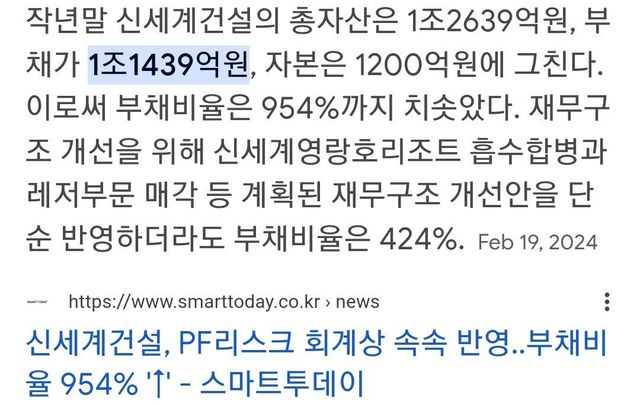신세계건설이라고 원래 그룹사 건물 아울렛, 백화점 등 수주 몰빵 받아서 꿀 빨던 회사였는데 뒤늦게 대구 주택시장에 뛰어들었다가 그냥 ㅈ망함