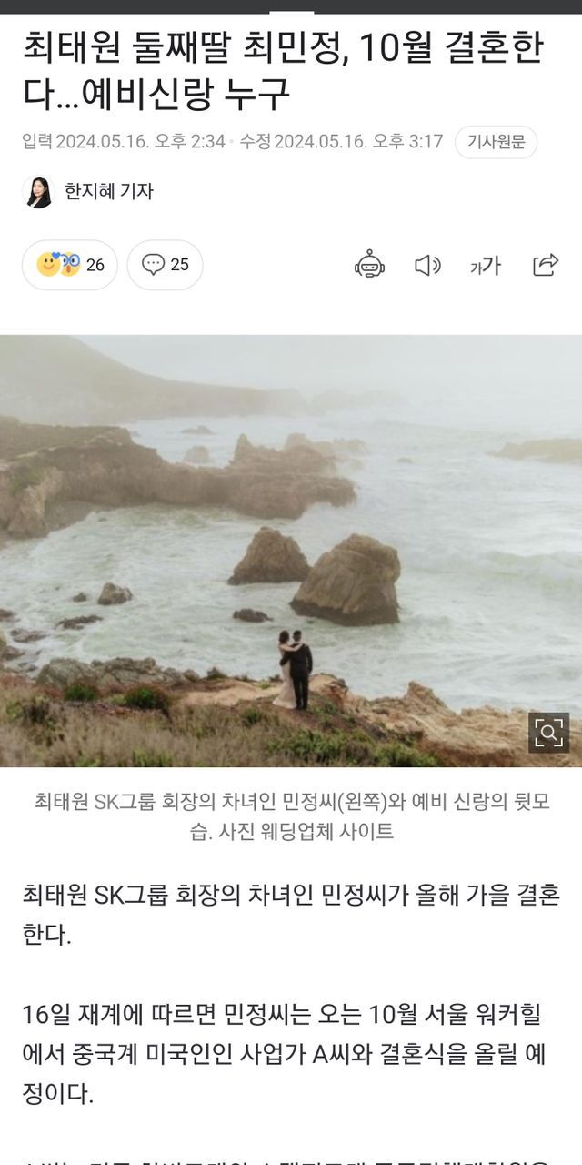 최태원 SK그룹 회장의 차녀 최민정 씨가 올가을 결혼할 것으로 전해졌다.