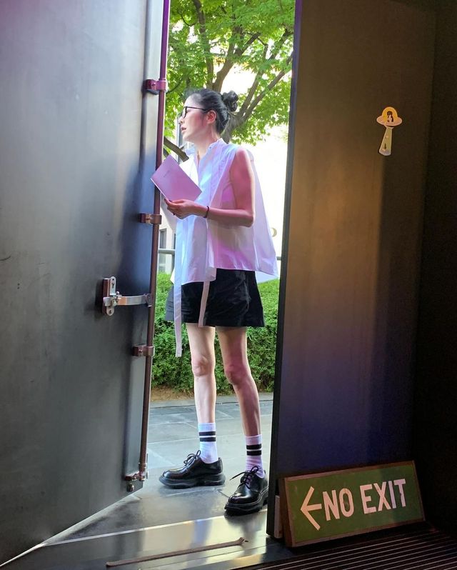 흰색 블라우스와 반바지, 올림머리 스타일링으로 시원한 여름룩을 선보이며 남다른 패션 감각을 자랑해 이목을 집중시킨다.