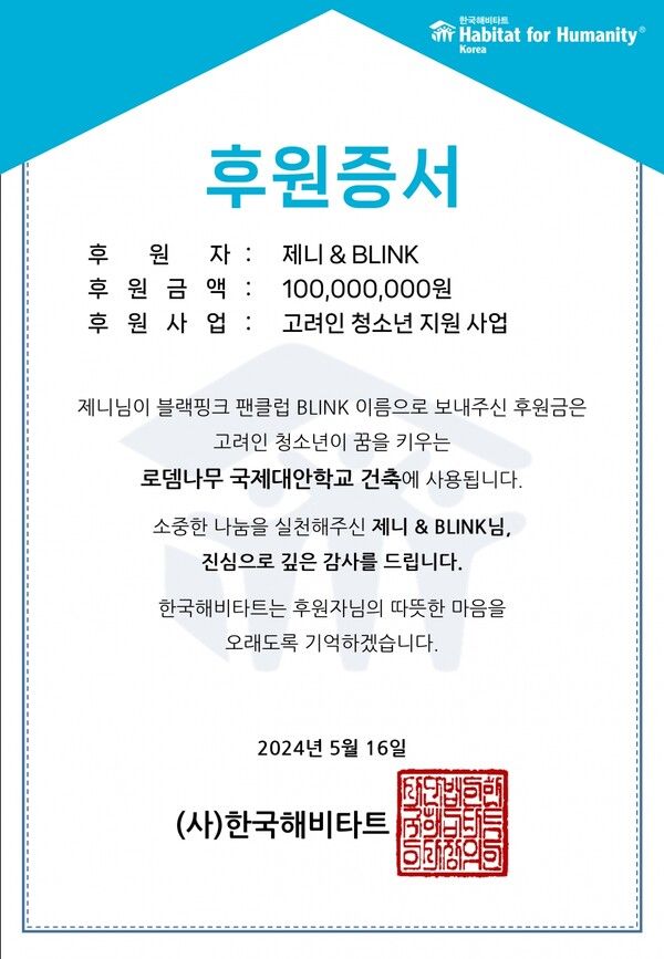 한국해비타트 측은 "제니가 팬클럽 BLINK를 사랑하는 마음을 담아 아이들의 꿈을 키워갈 학교 건축에 함께해준 데 감사를 전하며 사업의 빠른 착공을 위해 노력하겠다"고 밝혔다.