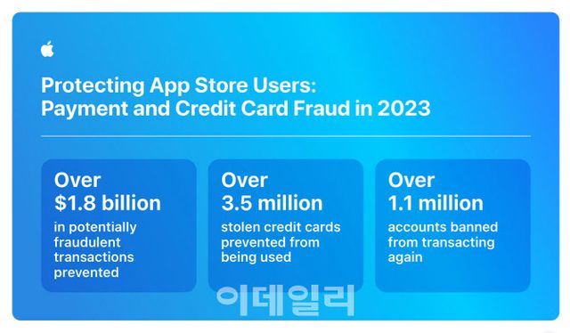 애플은 “지난 몇년간 디지털 위협의 범위가 넓어지고 복잡성이 증가함에 따라, 사용자를 보호하기 위해 앱스토어에서의 사기 행위를 모니터링하고 부정 행위자를 제거하기 위해 정교한 도구와 기술을 사용하고 있다”고 설명했다.