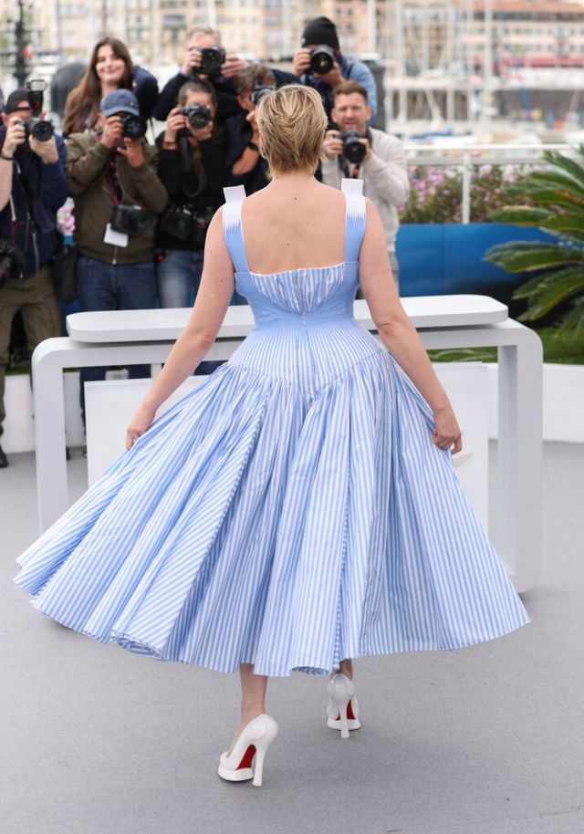 최근 영화 <바비(Barbie)>로 활동한 감독이자 배우인 그레타 거윅(Greta Gerwig)이 심사위원으로 칸영화제에 참석했습니다. 그가 착용한 블루와 화이트 컬러의 스트라이프가 돋보이는 코튼 트레스는 존 갈리아노(John Galliano)가 디자인한 메종 마르지엘라(Maison Margiela)의 2024 SUS 아티즈널 오트 쿠튀르 룩입니다. 이와 함께 크리스찬 루부탱(Christian Louboutin)이 메종 마르지엘라를 위해 준비한 화이트 펌프스를 함께 매치했습니다.