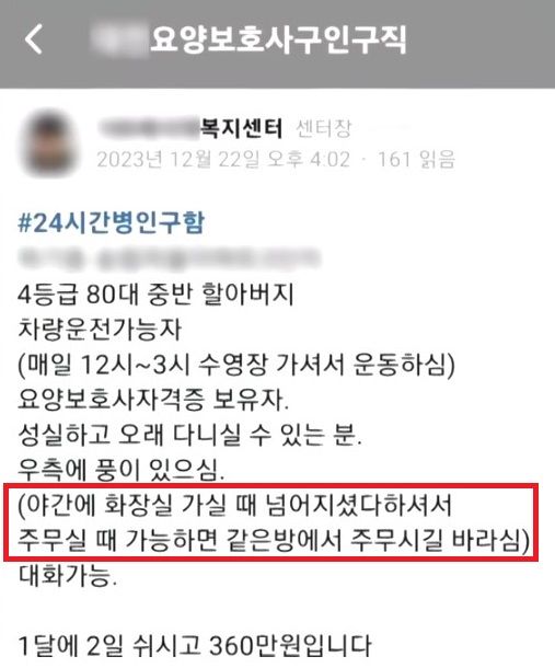 그런데 이와 함께 "화장실 가시다가 넘어지셨다 하셔서 주무실 때 가능하면 같은 방에서 주무시길 바라신다"는 조건이 함께 올라왔다.