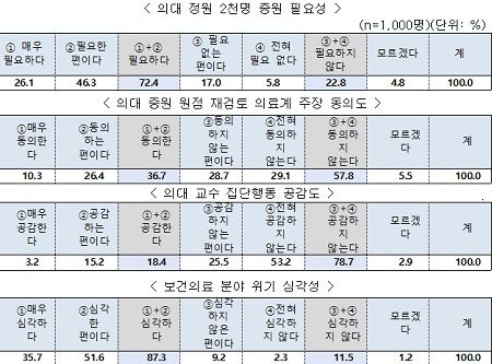 의대 정원 2,000명 확대가 필요하다고 응답한 국민이 72.4%(매우 필요하다 26.1%, 필요한 편이다 46.3%)로 나타났다.