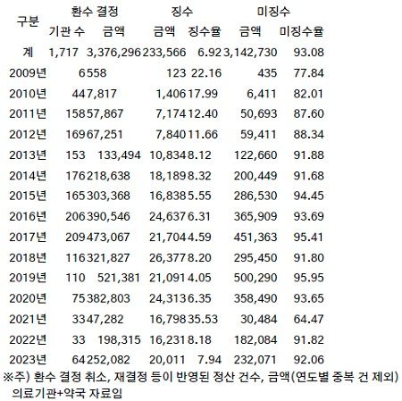 2009∼2023년 환수 결정된 요양 급여비용 중에서 건보공단이 징수한 것은 6.92%(금액 : 2,335억 6,600만원)만 실제 환수됐다.