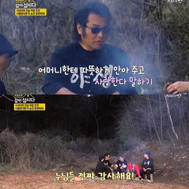 김보성은 애정 표현이 서툴다고 고백했다. 그러자 ‘같이 삽시다’ 멤버들은 “아들이 엄마한테 따뜻하게 손을 붙잡고 해주는 게 얼마나 가슴에 남겠냐”, “표현을 안 하면 모른다”, “연습을 많이 해서 살아계실 때 한마디라도 더 해야 한다”고 응원과 조언을 아끼지 않았다.