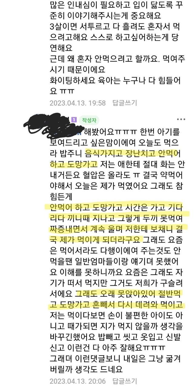 2. 집에서도 식사시간에 착석안되고 밥던지고 장난쳐서 부모 둘이 붙어서 온갖 쑈를 해야 먹고 그마저도 몇입 먹다 말아서 저혈당으로 쓰러질까봐 애 돌아다니는거 쫓아다니면서 일일히 먹여줌(훈육 전혀 안되고 있는 상황)