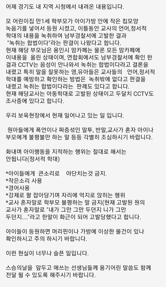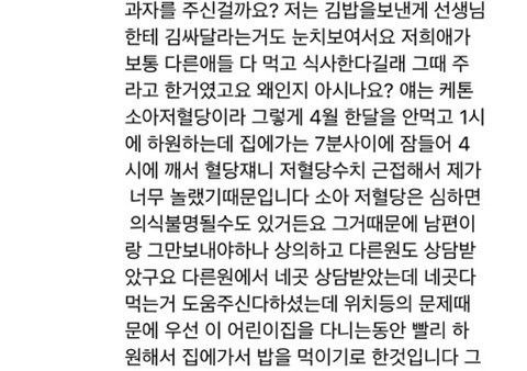 4. 그렇지만 보육교사는 애를 여러명 돌보는 상황에서도 착석도 안하고 밥먹기 싫어하는 애 붙잡아 밥을 먹게끔 노력해야하고, 애한테 과자를 줘서는 안되며, 본인애를 방치하는것 같아 기분나쁘고, “애아빠가 뒤집는다는거” 말렸지만, 결국은 기분나빠서 고소함