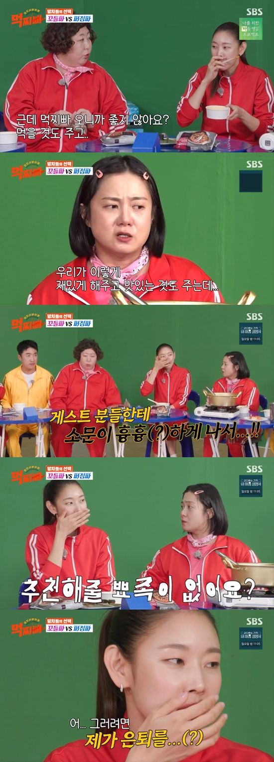 신기루는 한혜진에게 "근데 '먹찌빠' 오니까 먹을 것도 주고 운동도 시켜 주고 좋지 않냐"고 강요했다.