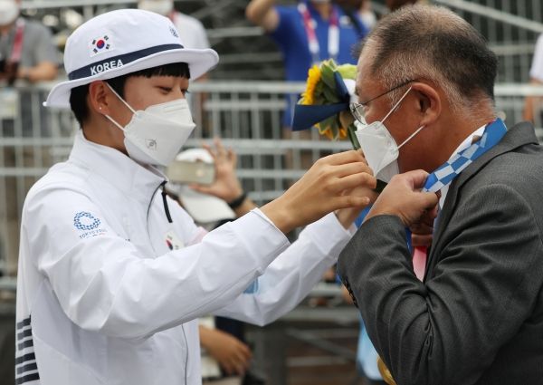 2020도쿄올림픽 시상식 장에서 양궁 3관왕에 오른 안 산 선수는 시상대에서 나와 정 회장의 목에 금메달을 걸어주며 눈물을 글썽이기도 했다. <위 사진>위>