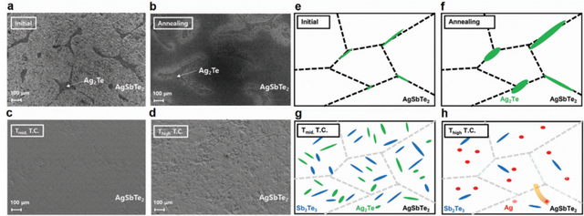 경희대학교(총장 김진상) 응용물리학과 이종수 교수 연구팀(응용물리학과 이종수 교수, 김진희 박사, 윤재현 박사)이 새로운 접근법을 개발해 열전소재의 열적 안정성을 크게 높였다. 열적 안정성이 높은 고효율 열전소재 개발로 전기 에너지 변환효율이 진보했다. 기존 열전소재는 고온에서 은-텔레늄과 안티몬-텔레늄의 상이 분리되며 전자와 정공이 엉켜 성능이 떨어졌다. 연구팀은 이 상분리 현상을 역이용해서 상분리가 안정화되면서 성능저하가 없는 조건으로 고온과 상온을 빠르게 오가면서 열적 요동을 가했다. 그 결과 열전소재의 입자가 열분해 되면서 열적으로 안정화되는 현상을 찾았다.