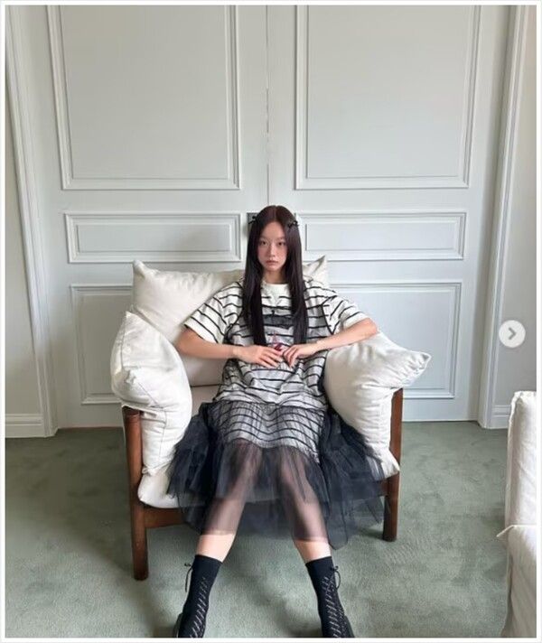 사진 속 혜리는 레이스가 달린 줄무늬 원피스를 입고 소파에 앉아 포즈를 취하고 있다. 마치 인형과 같은 비주얼을 자랑하는 혜리의 모습은 많은 팬들의 감탄을 자아냈다.