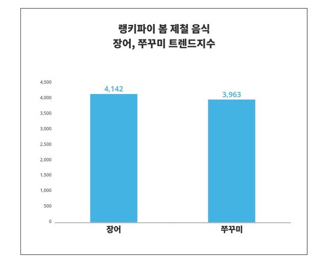 랭키파이의 분석에 따르면, 장어가 봄 제철 음식 트렌드지수에서 '4,142포인트'로 1위를 차지했다. 이어 쭈꾸미가 '3,963포인트'로 2위를 기록했다. 두 트렌드 사이의 지수 차는 '179포인트'로 나타났다.