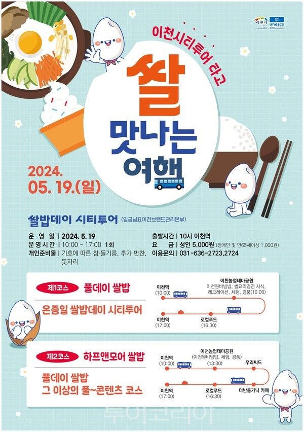 이번 ‘쌀 맛나는 여행’은 이달 19일 임금님표이천브랜드관리본부에서 개최하는 쌀밥데이를 테마로 ▲ 풀데이쌀밥 코스 ▲하프앤모어 쌀밥 코스 두 가지 코스로 운영한다.