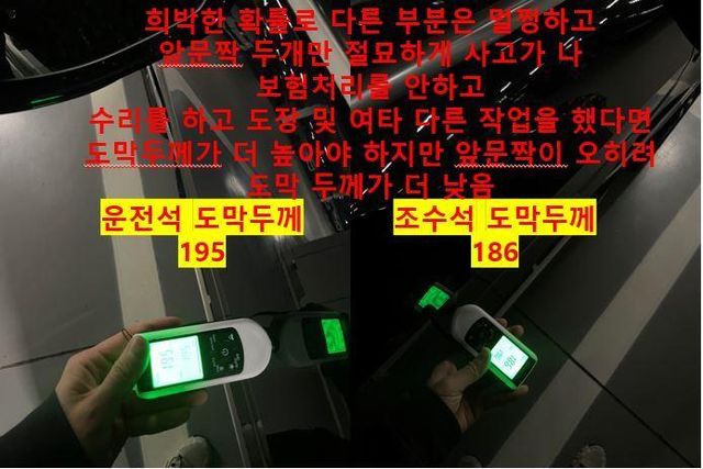 글쓴이는 앞문 두 개에선 도색, 판금, 내역이나 흔적이 전혀 나오지 않았다고 했다. 그러면서 “내가 문짝을 떼 도막 작업이나, 판금 작업을 했다면 도막이 타 부위보다 두꺼워야 한다. 하지만 도막 두께는 오히려 얇았다”고 전했다. 문을 아예 교체됐다는 뜻이다.
