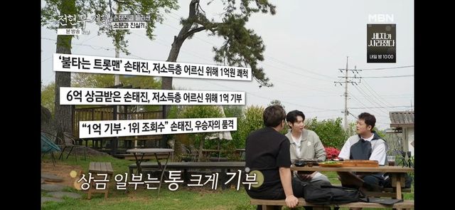 이어 전현무는 “(실수령액) 3억 후반대인데 그 돈으로 뭐 했나”라고 물었고 손태진은 “제일 먼저 했던 게, 팬들이 만들어준 우승인 만큼 노인분들을 위해 1억을 기부했다. 그 외에 해결해야 했던 경제적인 부분 채우고 지금 조금 남은 걸로는 저 자신한테 아직 선물을 못해서 고민 중이다”고 대답했다.