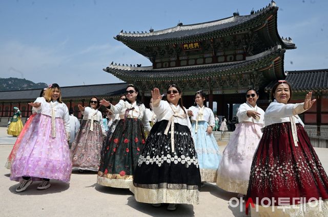 아시아투데이 박성일 기자 = 17일 국가유산청 출범을 기념해 전국 76곳 문화유산으로 지정된 명소가 무료로 개방됐다. 서울 종로구 경복궁 흥례문앞에서 한복을 입은 외국인들이 춤을 추며 즐거운 시간을 보내고 있다.