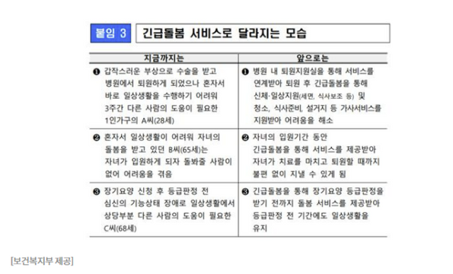 17일 보건복지부에 따르면 기존의 가사·간병 지원이나 노인장기요양 등의 돌봄 서비스는 대상자를 결정하는 데 한달가량이 걸려 신속한 서비스가 필요한 상황에서는 이용이 어려웠다. 이에 정부는 일시적 어려움을 해소하고 빠른 일상 복귀를 돕기 위해 긴급 돌봄 지원사업을 실시하기로 했다.