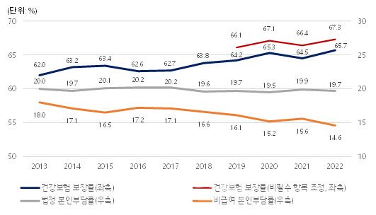 건보공단 관계자는 “2021년에는 의료 이용이 코로나19 이전 수준을 회복하고, 실손보험 이용 등으로 인해 비급여 진료가 증가해 보장률이 감소했다”며 “2022년에는 공단부담금은 증가한 반면, 백내장 관련한 실손보험 지급기준 강화 등에 기인한 의원급 중심의 비급여 진료 증가폭 감소로 건강보험 보장률이 전년 대비 상승했다”고 분석했다.