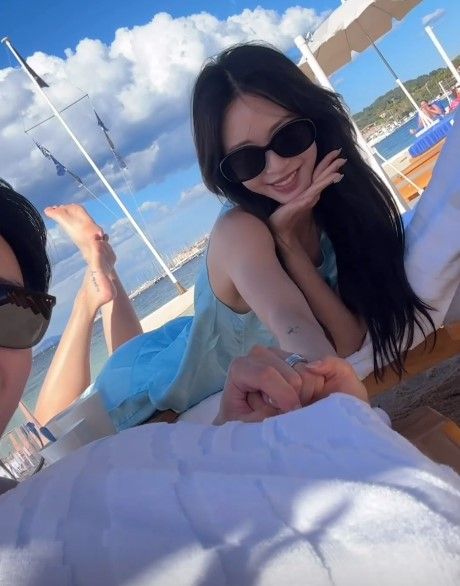 한예슬은 남편과 함께 선글라스를 끼고 선베드에 누워 해변에서 여유를 만끽하고 있다.
