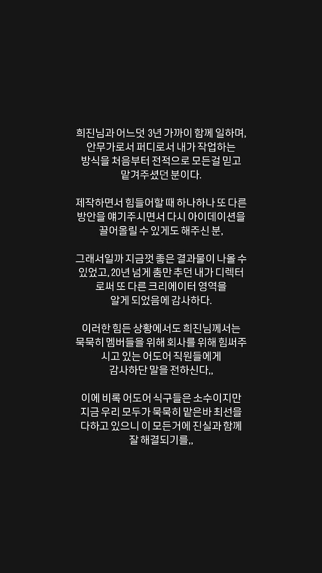 김 디렉터는 17일 오후 "(민)희진 님과 어느덧 3년 가까이 함께 일하며, 안무가로서 퍼디(퍼포먼스 디렉터)로서 내가 작업하는 방식을 처음부터 전적으로 모든 걸 믿고 맡겨 주셨던 분"이라고 입을 열었다.