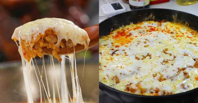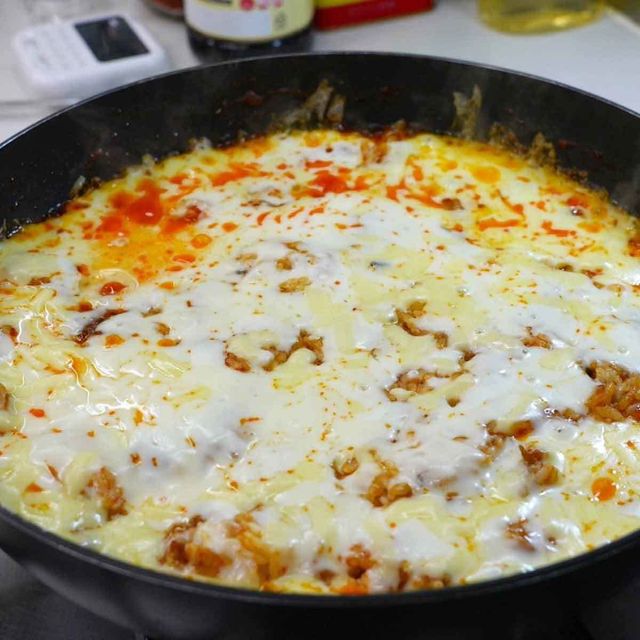 이어 치즈 2봉을 뿌리고 뚜껑을 닫아 약불로 녹인다. 간이 약할 경우, 소금 1꼬집을 뿌리면 좋다.