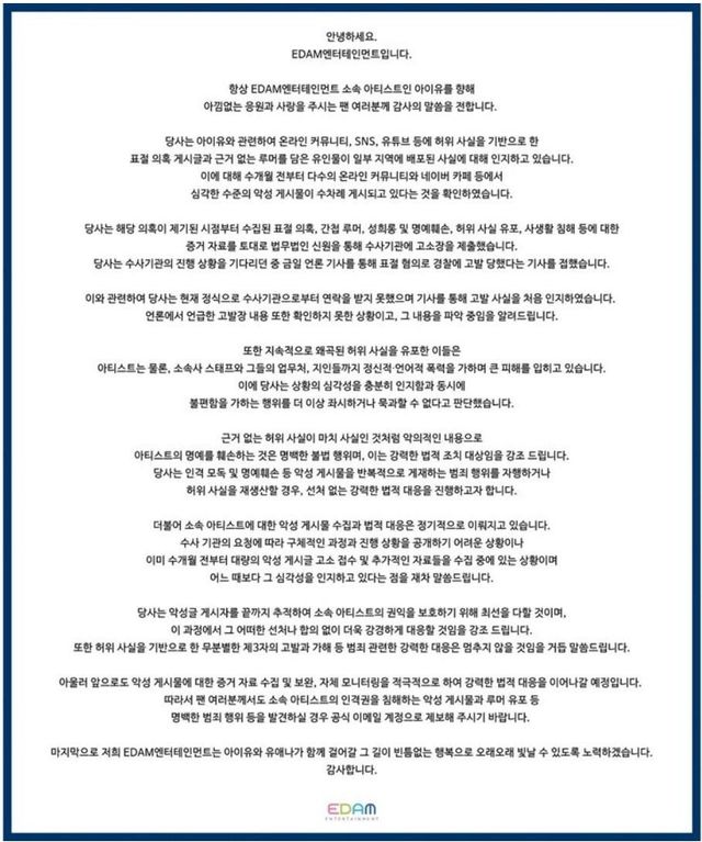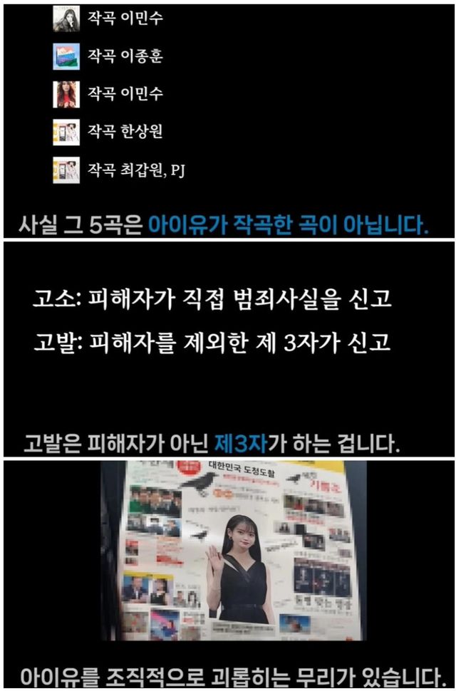 또한 “나머지 5곡은 아이유가 작곡한 곡도 아니다. 그런데 왜 고발인은 작곡가를 고발하지 않고 노래만 부른 아이유를 고발했을까. 애초에 고발인은 아이유를 괴롭히려 한 거다”라며 과거부터 아이유에 대해 조직적으로 표절 관련 의혹과 북한 간첩설 등을 제기한 악플러 집단을 언급했다.
