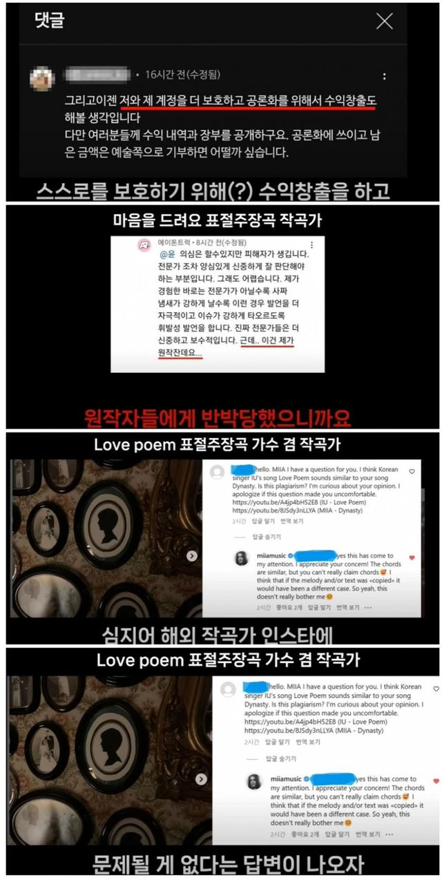 이어서 “이들은 아이유 관련 영상마다 악플 테러, 표절 의혹 제기 영상을 꾸준히 올렸고, 찌라시도 돌렸다. 또 이를 이용해 수익창출까지 했다. 그래도 논란이 생기지 않으니 경찰에 고발했다. 이들은 과거 ‘마음을 드려요’와 ‘Love Poem’에도 표절 의혹을 제기했었다. 그런데 두 곡 모두 원작자가 직접 등판해 ‘표절이 아니다’라고 답변을 남기자 댓글을 삭제했다”며 이들의 행태를 공론화했다.