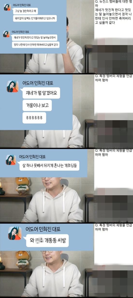이날 방송에서 이진호는 "민 대표가 기자회견에서 ‘개저씨’ 발언으로 여성들의 많은 지지를 받았다. 사회적인 갈라치기다. 민 대표가 평소 여성들을 보는 시선은 어땠을까"라며 "법정에서 공개된 자료인데 민희진 측에서 요청해서 모자이크 됐다. 그 카톡을 재구성했다. 멘트 자체는 있는 그대로 민희진 대표의 워딩을 그대로 담았다”고 강조했다