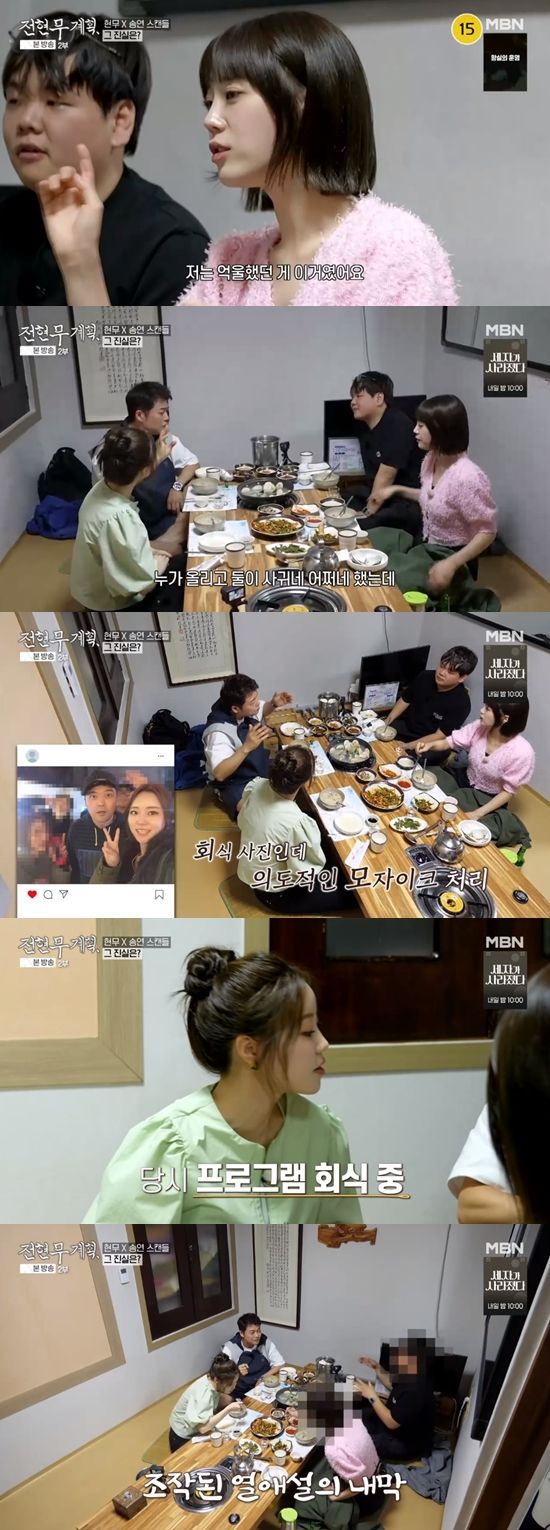 전현무는 "그게 무슨 얘기냐면, 나랑 허송연이 같이 찍힌 사진을 누군가 올리고 사귀니 마니 했는데, 10명이 함께 회식하는 자리인데 다른 사람은 다 지우고 올린 것. 허영지도 모자이크 당했다"고 전말을 밝혔다.