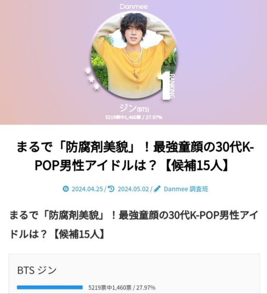 최근 일본 K-POP 한류 전문 미디어 '단미'(Danmee)가 주최한 "마치 방부제 미모! 최강 동안 얼굴의 30대 K-POP 남자아이돌" 설문조사에서 방탄소년단(BTS) 진은 1위로 선정됐다.