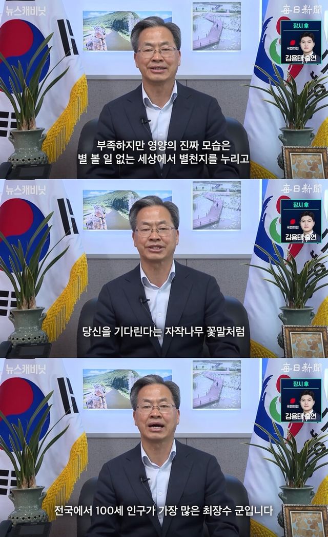 그러면서 "부족하지만 영양은 별 보기 힘든 요즘 세상에서 별천지를 누리고, 자작나무 숲 맑은 공기를 마실 수 있는 전국에서 100세 인구가 가장 많은 최장수 군"이라고 말했다.