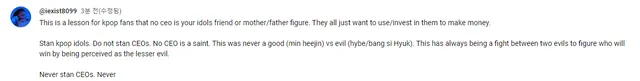 번역: <이는 어떤 CEO도 아이돌의 친구나 어머니/아버지 같은 인물이 아니라는 점을 kpop 팬들에게 가르쳐주는 교훈입니다. 그들은 모두 돈을 벌기 위해 사용/투자하고 싶어합니다. 스탠 케이팝 아이돌. CEO를 비난하지 마십시오. 어떤 CEO도 성인이 아닙니다. 이건 결코 선(민희진) 대 악(하이베/방시혁)의 대결이 아니었습니다. 이것은 항상 덜 악한 것으로 인식되어 누가 승리할지 파악하기 위한 두 악 사이의 싸움이었습니다. 결코 CEO가 아닙니다. 절대>