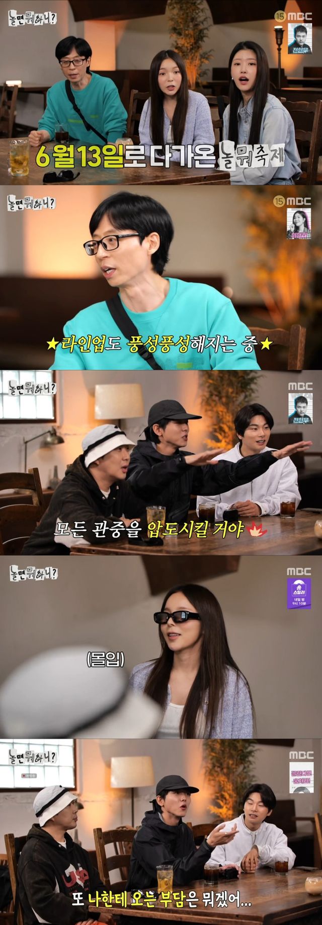 이날 유재석은 오는 6월 13일 '놀뭐 축제'에 참가할 게스트 라인업이 풍성해지고 있다는 소식을 전했고, 멤버들은 환호했다.