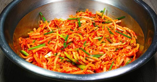 이렇게 해서 간단하면서도 아삭한 여름 별미, 무생채가 완성된다. 무는 소화를 돕는 효소를 함유하고 있어, 소화를 촉진하는 데 도움을 준다.
