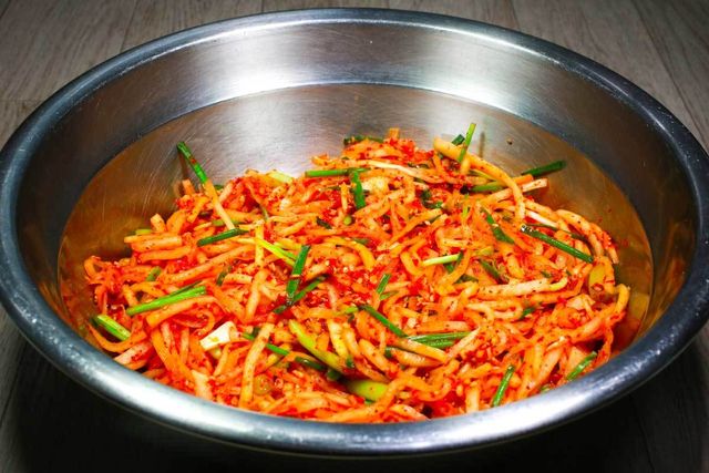 다음은 준비한 양념 재료들을 모두 섞어 양념장을 만든다. 이제 절인 무에 만든 양념장을 골고루 섞어준다. 양념이 고루 배게 손으로 조물조물 섞는 것이 좋다.