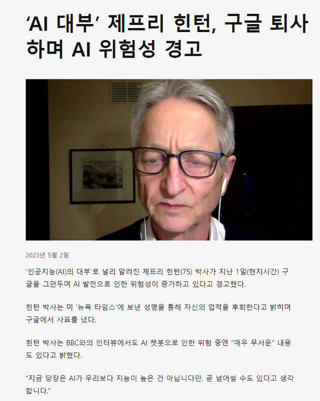 AI의 발전이 너무 무섭다면서 그 위험성을 알리기 위해 구글을 퇴사하기까지 함.