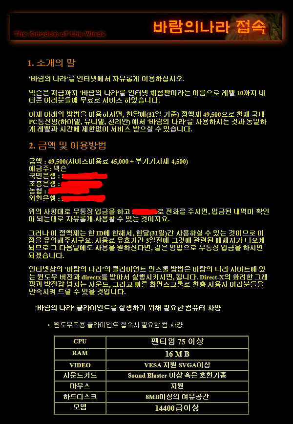 90년대 게임 요금표 및 권장사양