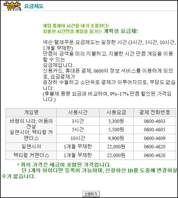 2000년대 게임 정액제 요금표