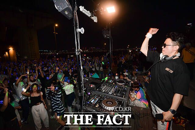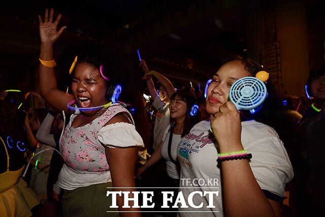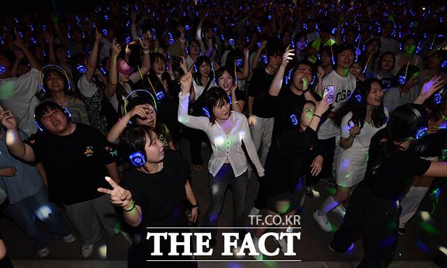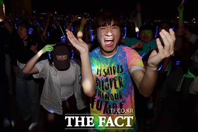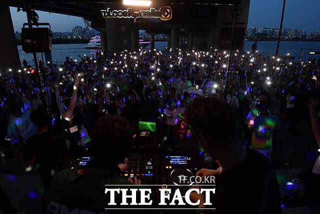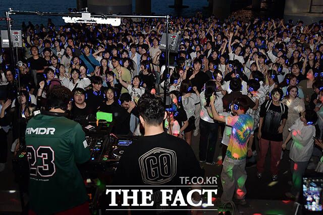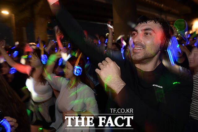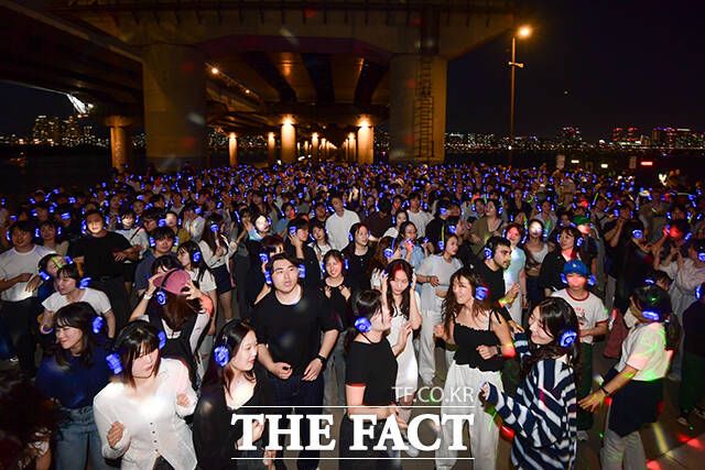 [더팩트ㅣ장윤석 기자] 한강 무소음 DJ 파티가 18일 오후 서울 여의도 한강공원 마포대교 하부에서 열린 가운데 시민들이 무선 헤드셋으로 음악을 들으며 즐거운 시간을 보내고 있다.
