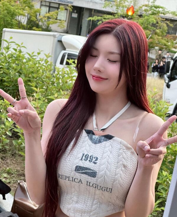 또한 그는 '불' 이모티콘과 함께 해당 무대에서 입은 홀터넥 크롭 니트룩을 입고 브이 포즈를 지으며 보는 시선을 사로잡는다.