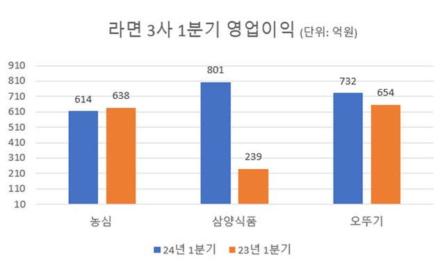 다만 농심은 눈에 띄는 수혜를 입지 못했다. 농심의 1분기 영업이익은 614억원으로 전년 동기보다 3.7% 줄었다. 매출은 8725억 원으로 1.4% 증가했다.