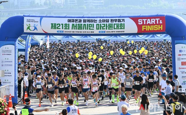19일 서울 여의도 한강공원 이벤트광장에서 아시아투데이와 소아암환우돕기 조직위원회 공동주최로 열린 '제21회 소아암환우돕기 서울시민마라톤대회'에서 참가선수들이 힘찬 출발을 하고 있다. /정재훈 기자