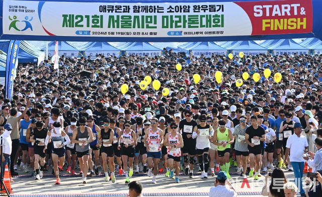 19일 서울 여의도 한강공원 이벤트광장에서 아시아투데이와 소아암환우돕기 조직위원회 공동주최로 열린 '제21회 소아암환우돕기 서울시민마라톤대회'에서 참가선수들이 힘찬 출발을 하고 있다. /정재훈 기자