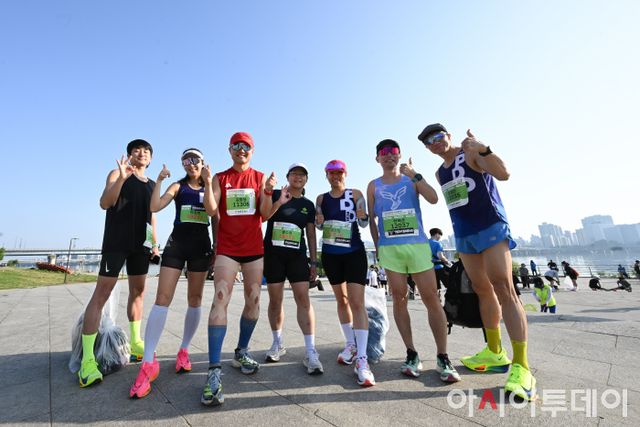 19일 서울 여의도 한강공원 이벤트광장에서 아시아투데이와 소아암환우돕기 조직위원회 공동주최로 열린 '제21회 소아암환우돕기 서울시민마라톤대회'에서 참가선수들이 출발에 앞서 기념사진을 찍고 있다. /정재훈 기자