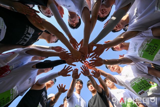 19일 서울 여의도 한강공원 이벤트광장에서 아시아투데이와 소아암환우돕기 조직위원회 공동주최로 열린 '제21회 소아암환우돕기 서울시민마라톤대회'에서 참가선수들이 출발에 앞서 화이팅을 외치고 있다. /정재훈 기자