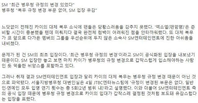 병무청 “복무 규정 변경 부문 없어, SM 입장 유감”