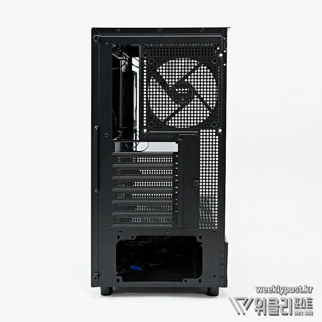 공기의 흡입이 이루어지는 우측면 사이드 패널에는 충분한 공기흡입을 위한 에어홀과 먼지필터가 있다. 해당 위치에는 240mm 규격의 라디에이터도 장착할 수 있어 2열 수냉을 사용하는 경우라면 기본 제공하는 쿨링팬을 제거하고 라디에이터 설치공간으로 활용할 수도 있다.
